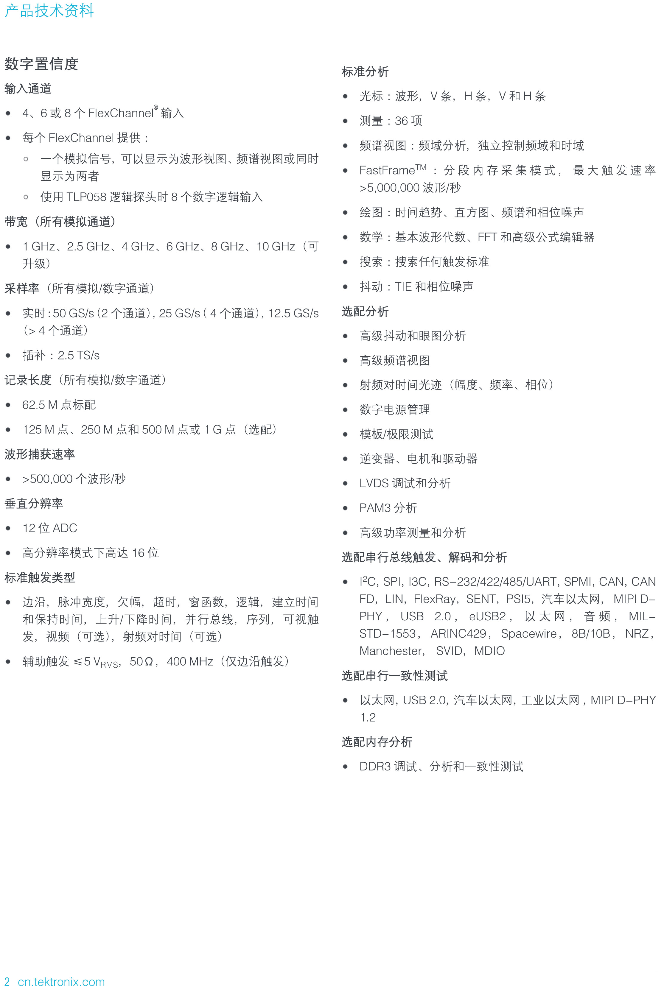 | 1 | 混合信號(hào)示波器 | Tektronix | MSO64B 6-BW-2500 | 4模擬通道,每通道模擬帶寬:2.5 GHz,上升時(shí)間:160 ps 最大實(shí)時(shí)采樣率:50GS/s 最優(yōu)本底噪聲:51.8 µV 50 ?時(shí)輸入靈敏度: 1 mV/div至1 V/div 1M ?時(shí)輸入靈敏度: 500 µV/div至10 V/div 垂直分辨率ADC:12位,最高模式:16位 2GHz條件下,通道隔離度≥50dB 每秒可采集≥50萬(wàn)個(gè)波形 觸發(fā)功能:欠幅,邏輯,脈沖寬度,窗口,超時(shí),上升/下降時(shí)間,建立與保持時(shí)間違例,串行數(shù)據(jù)包,并行數(shù)據(jù),序列,視頻,可視觸發(fā),射頻頻率對(duì)時(shí)間,射頻幅度對(duì)時(shí)間 供電:前面板連接器提供了最高80 W功率,可連接的所有TekVPI 探頭供電,無(wú)需使用額外的探頭電源 信號(hào)分析功能,測(cè)量36項(xiàng) 分段存儲(chǔ)模式,最大觸發(fā)速率為每秒 >5,000,000 個(gè)波形 統(tǒng)計(jì)(平均值、極值,標(biāo)準(zhǔn)差等) 可自定義參考線(xiàn)用于顯示波形時(shí)間、幅值等相關(guān)參數(shù) 集成頻譜分析功能 可實(shí)時(shí)計(jì)算FFT重疊 對(duì)數(shù)刻度顯示頻率分析結(jié)果 可自動(dòng)測(cè)量頻率峰值 可將波形信息以原始測(cè)量結(jié)果、圖像、報(bào)告等不同格式保存為文件 數(shù)字輸入通道:32個(gè),多種數(shù)字信號(hào)觸發(fā)類(lèi)型,包含邊沿觸發(fā)、寬度觸發(fā)、碼型觸發(fā)等 可通過(guò)碼字顯示組合顯示多路并行總線(xiàn)的值 支持遠(yuǎn)程桌面登錄示波器進(jìn)行控制 配置探頭根/每通道 1GHz 電壓探頭 10M?輸入阻抗 輸入容抗:3.9pF 動(dòng)態(tài)范圍:300V |